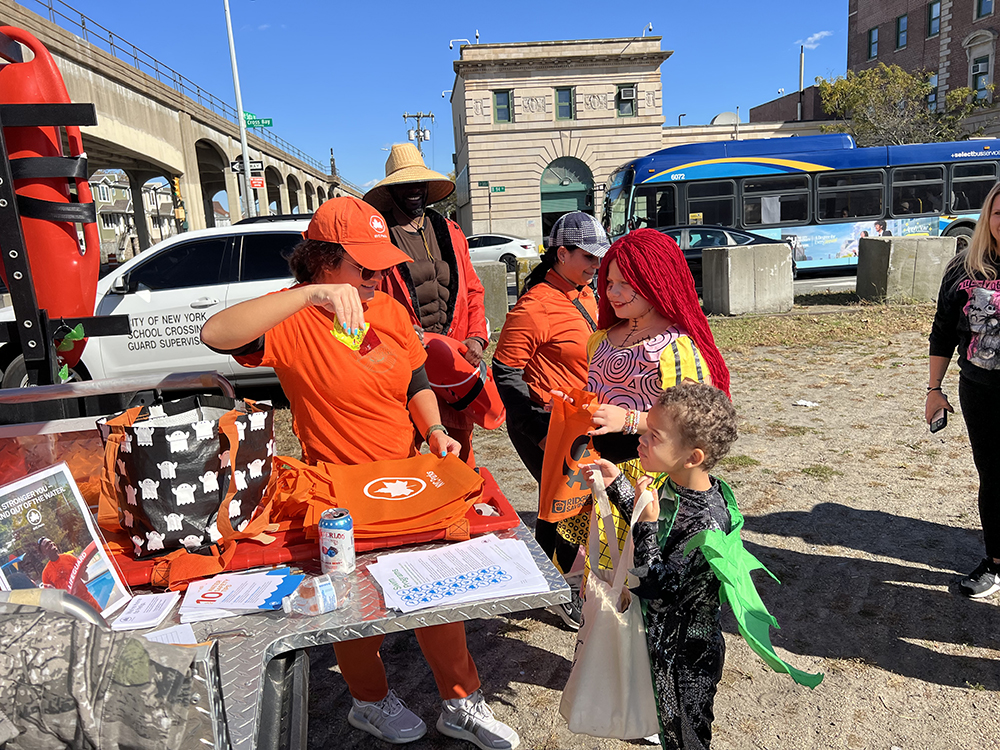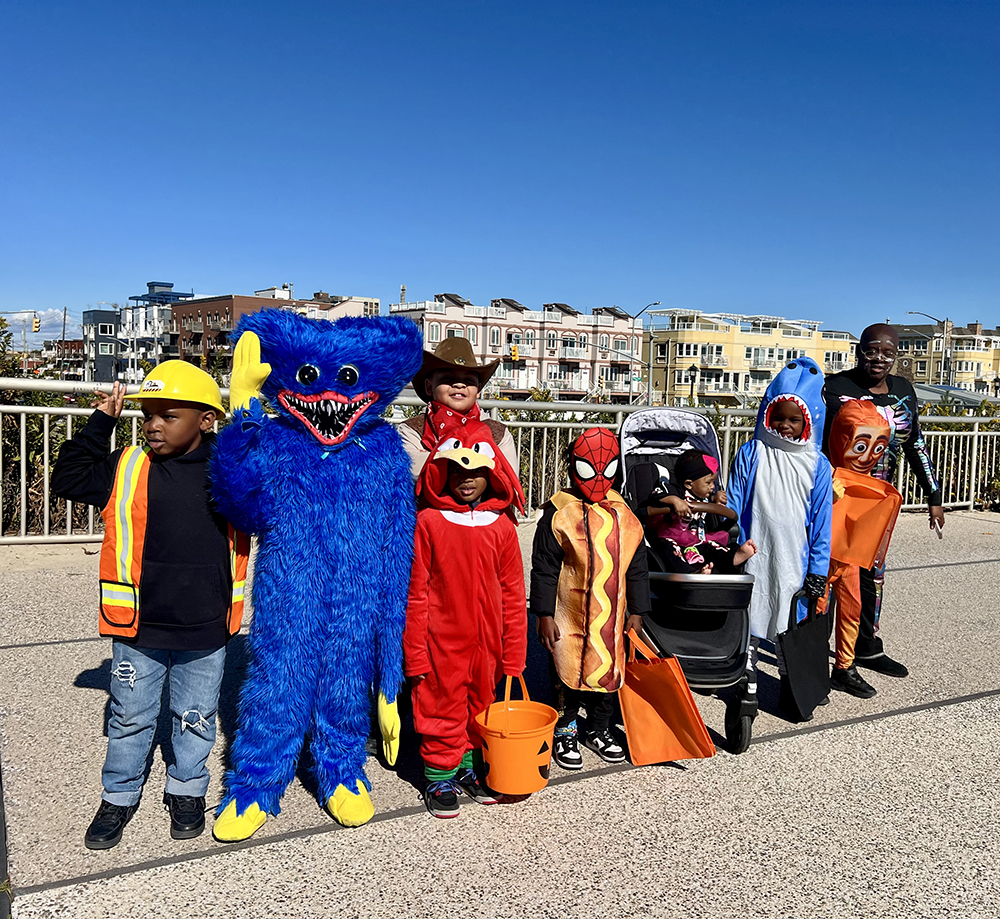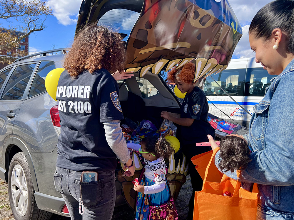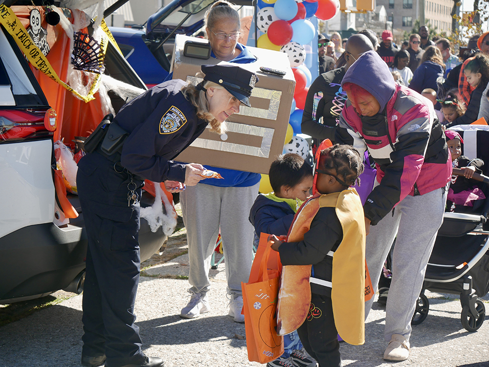 On a beautiful Saturday, October 25, the 100th Precinct held its annual Trunk-Or-Treat for the community. The event started with a Halloween parade on the boardwalk as costumed dinosaurs, gladiators, bananas and more made their way from Beach 102nd to Beach 94th, with Officer Jason Farrell leading the way on a police scooter with a spooky skeleton on the back. Once they reached Beach 94th, the Precinct’s parking lot was open to all with trunks full of candy and goodies awaiting.