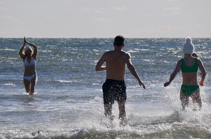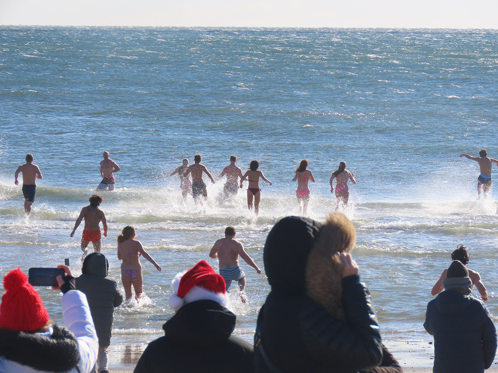 There’s only one way to face a 25-degree day with wind gusts making it feel even colder before jumping into a 42-degree ocean at low tide—by pretending like you’re marching into battle. At least, that’s how Beach 119th does it for the annual polar plunge to ring in the New Year. And this year’s Beach 119th plunge ended with another ring.
