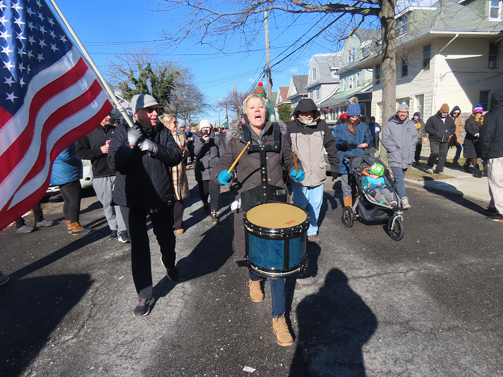 Despite the low temps, the high winds and even an early-morning snow squall giving the peninsula a fresh coating of snow, neighbors from Beach 119th Street, joined by family and friends, marched to the beat of a drum with an American flag raised high in the air, as they prepared to take on the challenge of celebrating a new year with a freezing dip into the ocean.