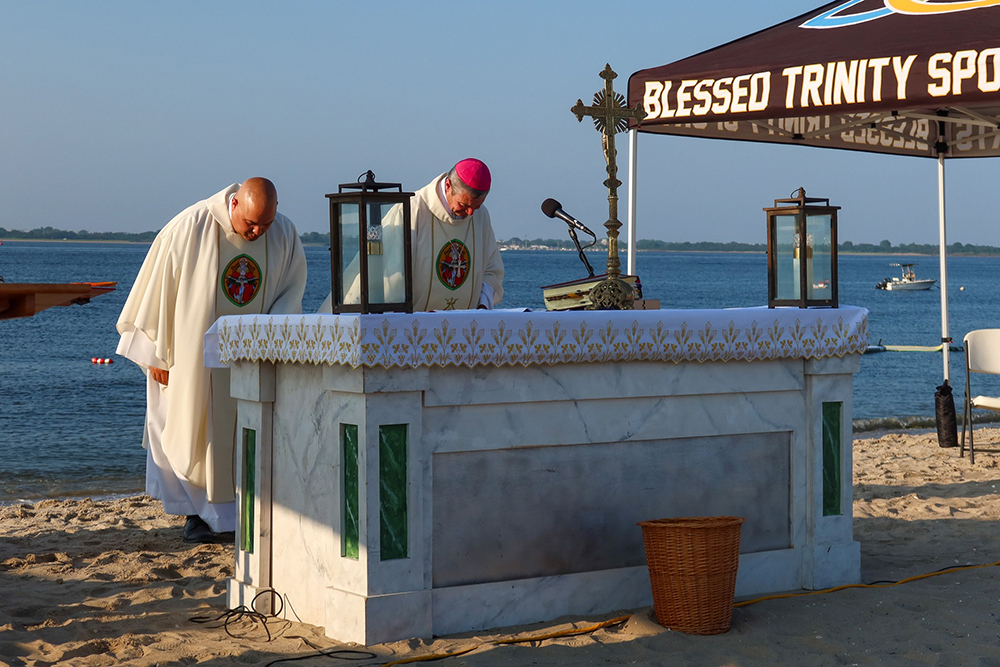 Breezy Point’s Assumption tradition, however, is not nearly as ancient or obscure as these legends. According to Maureen McVeigh, a longtime employee of Blessed Trinity, the parish began observing the Feast of the Assumption with a beachside mass in 2002 under then pastor Msgr. Michael Connelly. Not long before, the people of the community had gathered to mourn the over 30 residents lost in the September 11th attacks on the same shoreline, staring out at what had become an eerily empty skyline and entrusting their hopes and fears to the waves.  Msgr. Connelly recognized the solace that the bay’s beauty brought to his flock in their time of need and ensured that they would continue to return to the water each year to pray for healing.