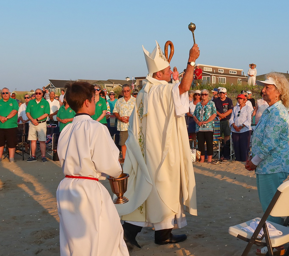 One legend tells of a medieval bishop who, caught in a violent storm in the Mediterranean, cast his episcopal ring into the tide and begged Mary to deliver him safely to shore. Hearing the bishop’s cries in heaven, Mary is said to have rescued him from the tempest and to have guaranteed safe travel to all sailors on the open seas on this sacred feast of hers.  Many bishops of coastal dioceses, like our own Bishop Brennan, continue to make it a point each year to personally bless the waters on this day to pray for the health and safety of their flock.