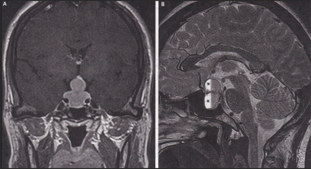 The patient’s serum prolactin level (hormone made in the pituitary that stimulates breast milk production) was 200 (reference range 3.3 to 26.7 in a non-pregnant woman), and she had both adrenal and thyroid hormone deficiencies (both glands are controlled by the pituitary gland). A diagnosis of a prolactin-secreting pituitary macroadenoma was made. Transsphenoidal surgical resection was performed (removed via the nose). Her symptoms resolved on postoperative day three, and one year later a repeat MRI showed pituitary tissue in the sella tursica and no other abnormalities.