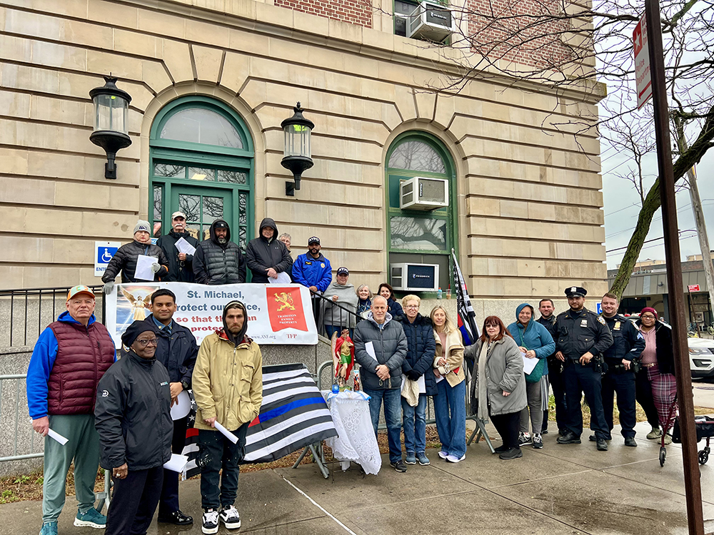 The group hung large signs saying, “God Bless and Protect Our Police” and “St. Michael, protect our police so that they can protect us!” on the outside of the precinct and brought a statue of St. Michael, standing above an NYPD badge, as each member held rosary beads and prayed through word and song. At the end of the ceremony, Ruane said, “We pray and offer our support so that our officers don’t lose hope, no matter what,” and shared a story of a recent conversation she had with an officer who told her that he felt hopeless. “I feel so bad for him. I don’t want him to feel he has no hope,” she said.