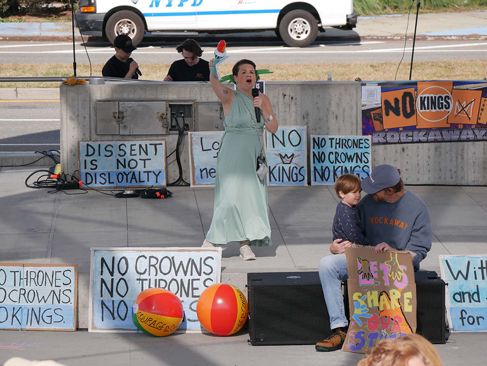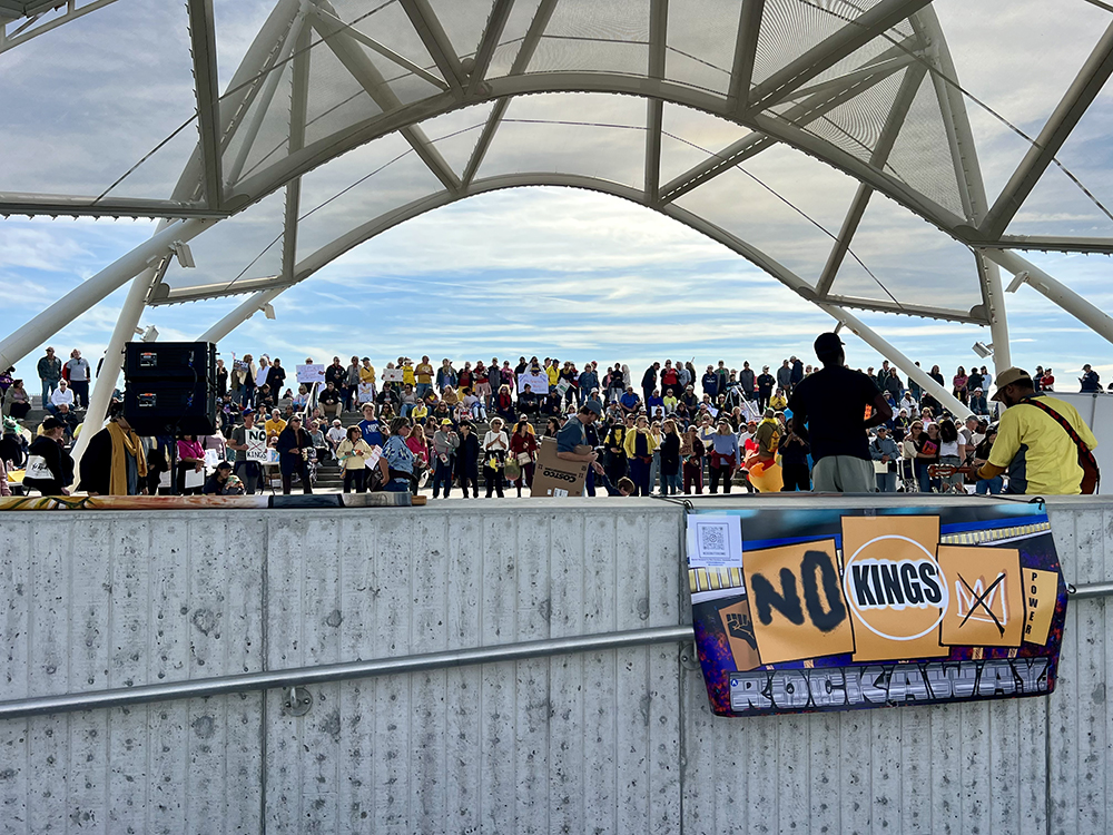 “This is what democracy looks like…No Kings Rockaway!” chants could be heard at the Rockaway Beach Amphitheater on Saturday, October 18, as a group of Rockaway residents participated locally as part of a nationwide No Kings rally day.