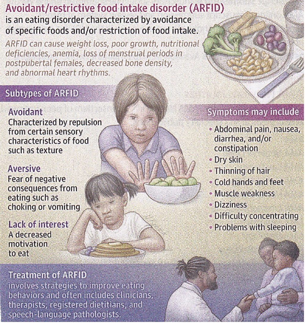 As anyone who has raised kids knows, kids (and some adults) can be finicky eaters. Avoidant/restrictive food intake disorder (ARFID) is an eating disorder characterized by avoidance of specific foods and/or restriction of food intake. ARFID has three major subtypes: avoidant is characterized by repulsion from certain sensory characteristics of food; aversive involves fear of negative consequences from eating, such as choking or vomiting; and lack of interest is characterized by decreased motivation to eat.