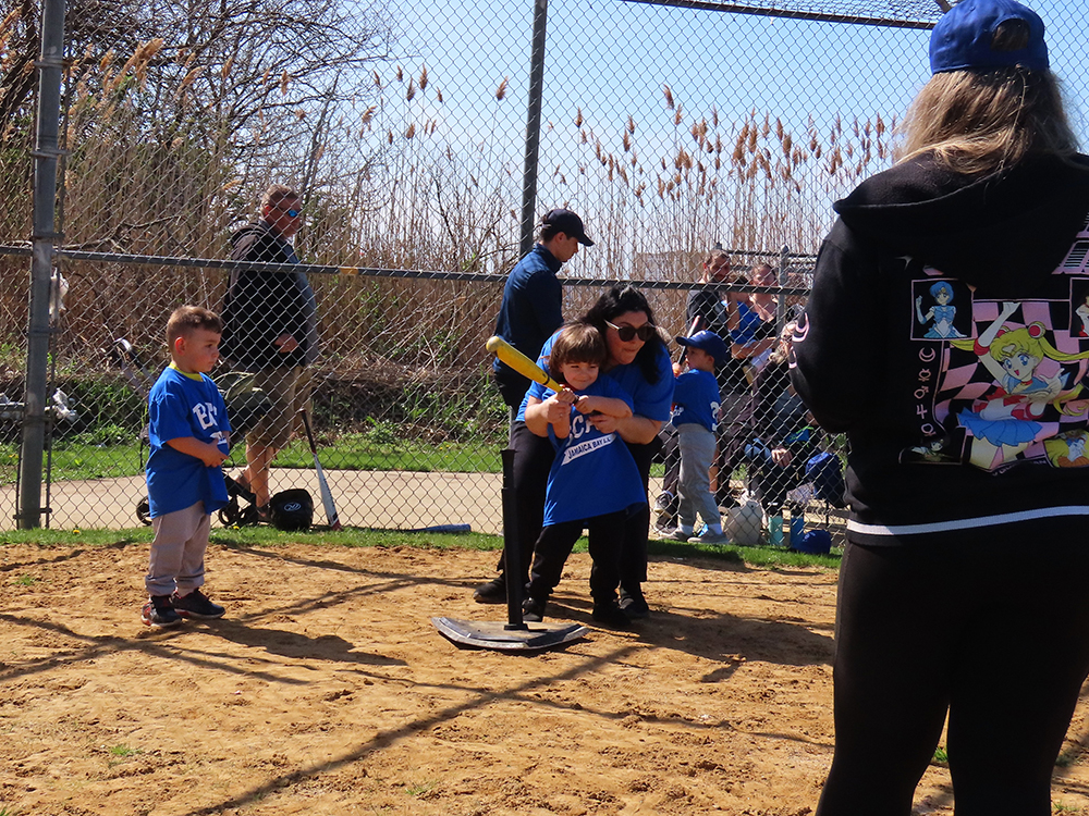 Coaches and helpers then took their teams, arranged by age, out to the field’s six baseball diamonds to get in a few games, along with pitching and catching practice and learning some basics. For the youngest players, this included a volunteer for each child to help the little ones learn skills like batting and running in the right direction towards the bases.