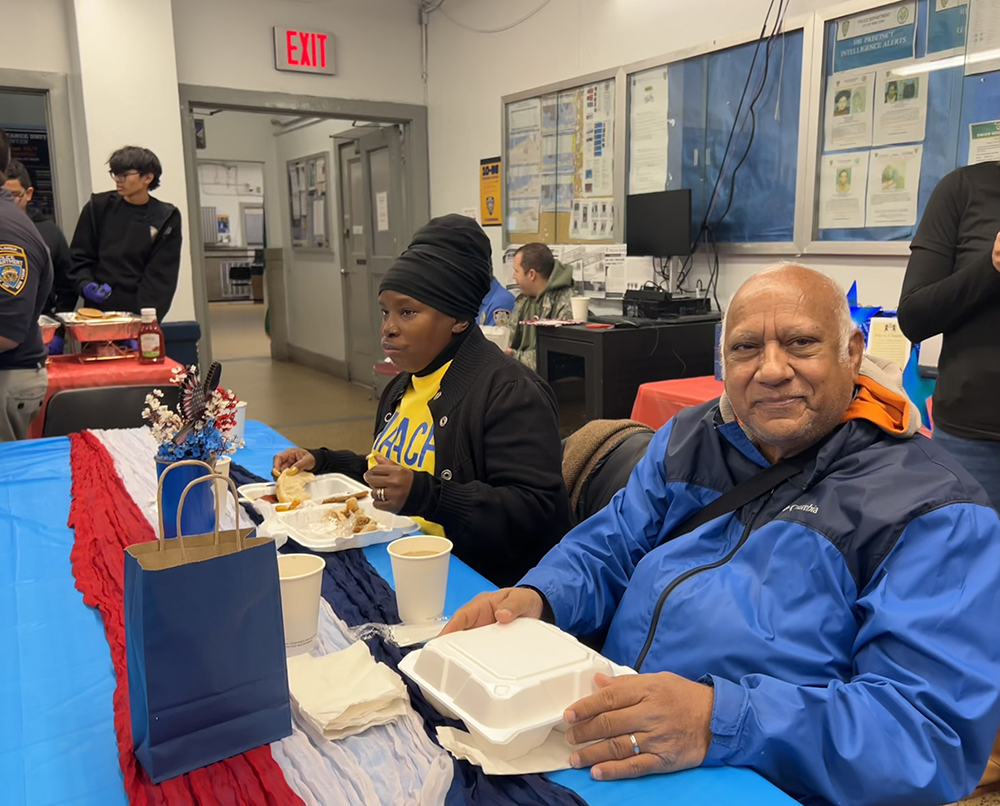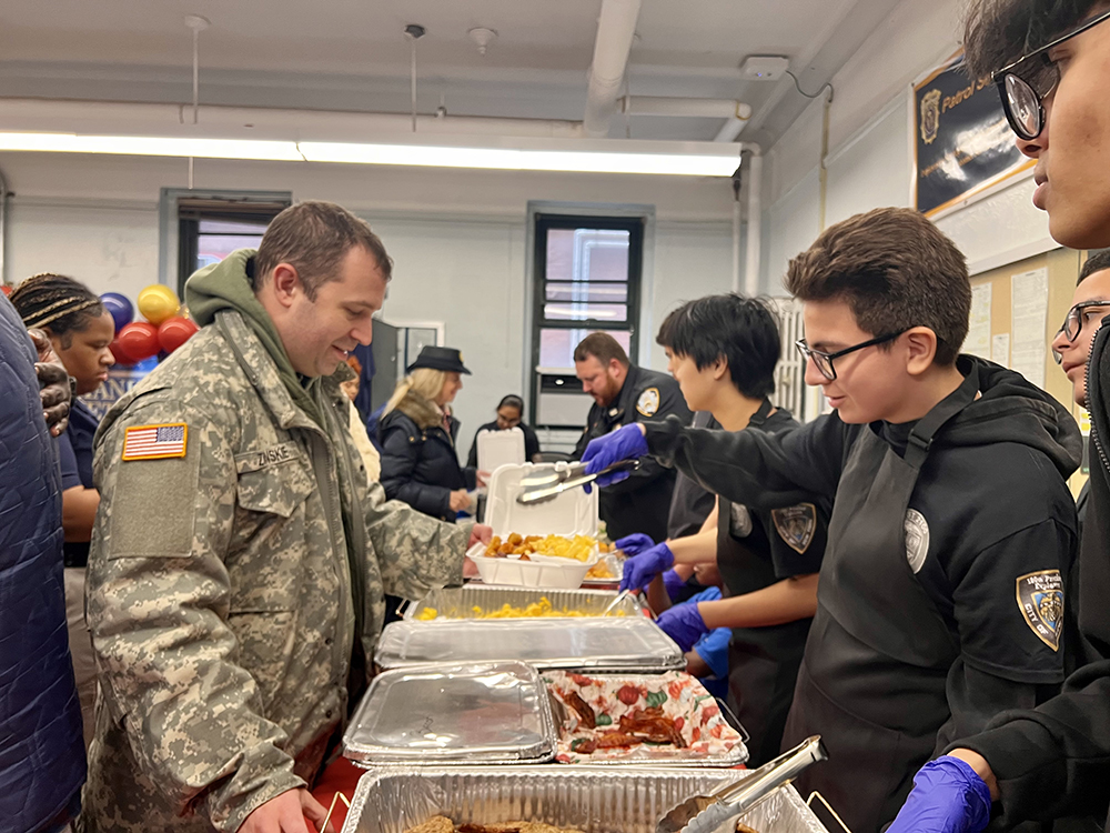 Hauk’s service kept him relatively local, going to basic training at Fort Knox, learning about finance at Fort Benjamin in Indiana, to Fort Drum upstate and Fort Monmouth in NJ. Hauk shared that some of those places no longer exist or have been repurposed as parks. “The good thing is now most of those forts are closed because there’s no war. It’s great we’re not at war now,” Hauk said. He also acknowledged that with fewer youth involved in the military, most only learn about the service through those who have served, like the youth serving the veterans food on Tuesday. “It’s great to see people honoring veterans. A lot of young people don’t remember because they weren’t around for Vietnam and the younger ones weren’t around for the smaller wars like in Afghanistan, and not many people are in the military, especially from NY and NJ because there are good jobs here, so it’s a good thing they have these Explorers here so they can get experience with people who were in the military,” he said of the 100th Precinct’s event. Looking back on his own service, Hauk said, “It was a good thing I went. I got to know a lot of people. Basic training was tough but after that it was fun.”