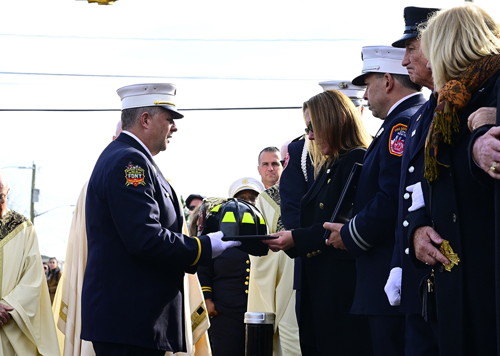 As “Raise One for Pat Boys,” a song created by Peter Brady, Taylor Searing and Bobby Butler, was played, members of the FDNY brought out Brady’s casket, where it was blessed by Cardinal Timothy Dolan himself, and Kara Brady was presented with Pat’s Ladder 120 helmet, before the procession continued through the streets of Rockaway, Broad Channel and Howard Beach, continuing to be met by a sea of neighbors in red, waving flags as the procession made its way to Brady’s final resting place at St. Charles Cemetery in Farmingdale.