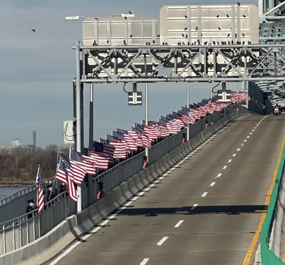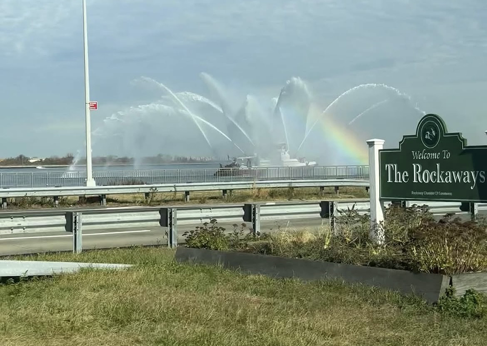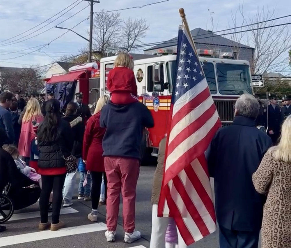 In a procession made for Rockaway royalty, Patrick Brady’s flag-draped casket sat high atop a Ladder 120 fire engine, led by an NYPD and firefighter escort from Marine Park Funeral Home, across the Marine Parkway Bridge, where FDNY firefighters stood along the pedestrian path holding American flags as the procession passed by, while the FDNY’s harbor unit sprayed water from Jamaica Bay, forming rainbows high above them. As the procession reached Cronston Avenue, Brady was greeted by a different sea of blue, as firefighters lined the street for more than 10 blocks, while a sea of red-clad members of the community waved American flags as the procession, now joined by the FDNY Emerald Society bagpipers, made its way to St. Francis de Sales Church, Brady’s parish down the block from his home.
