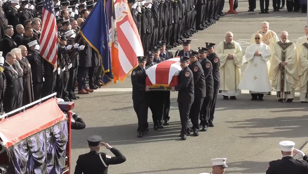 “I encourage all of you to be like Pat, to start a group chat, to drink Irish coffee, and to be a shark. And so, heeding my own advice, I want to do my first shark-like thing that we don’t do typically in the FDNY,” Tucker said. “And it is out of a sense of great love, an abundance of gratitude for all that Pat did for the FDNY, for the gift of Pat, that I posthumously promote him to the rank of lieutenant in the FDNY,” he ended, as the attendees stood and filled the church with applause.