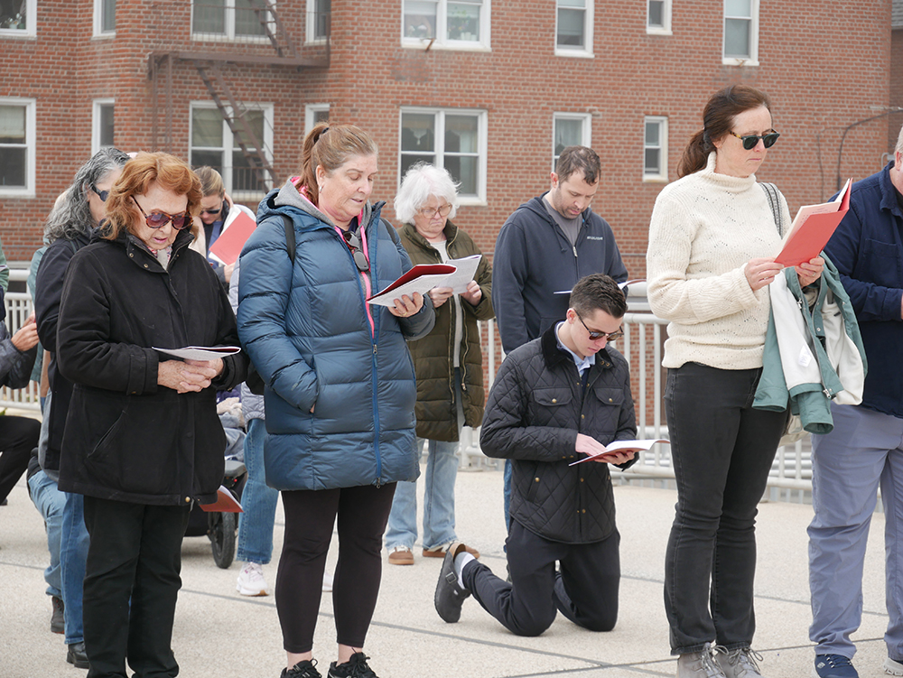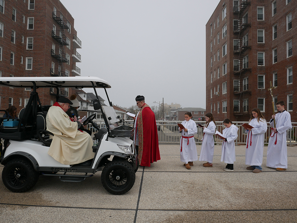 The Stations of the Cross are the 14-steps that commemorate Jesus’ last day on earth, from his condemnation to death, to his crucifixion, to being laid in the tomb. Each year, St. Francis de Sales Church holds a ceremony on the boardwalk to read out each step while carrying a cross. This year’s ceremony, starting on Beach 126th Street on the overcast afternoon was led by Father Jim Cunningham and Father Bill Sweeney, who rode along in a “pope-mobile” which carried a sound system for the ceremony, as more than 100 parishioners followed behind.
