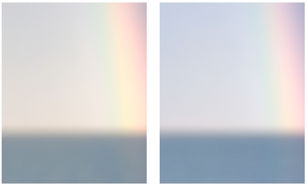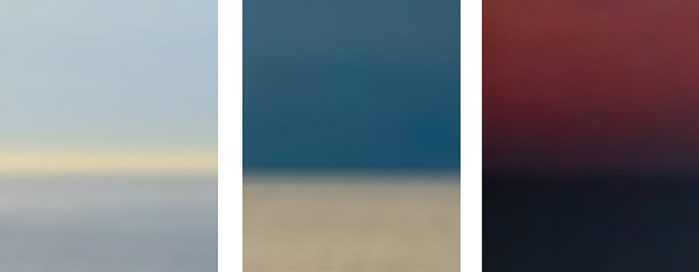 Now she brings the sea to the viewer and the viewer to the sea with Sea Chapel. The multipanel installation was created using screen captures from Rockaway webcams that live stream views of the Atlantic Ocean, and Mark Rothko’s abstract color field paintings inspired her to digitally manipulate selected sections of each capture. She made abstract the ocean view and rendered it more ideal than real with soft-focus bands and broad washes of color. Even the title, Sea Chapel, is in homage to Rothko Chapel in Houston, Texas.