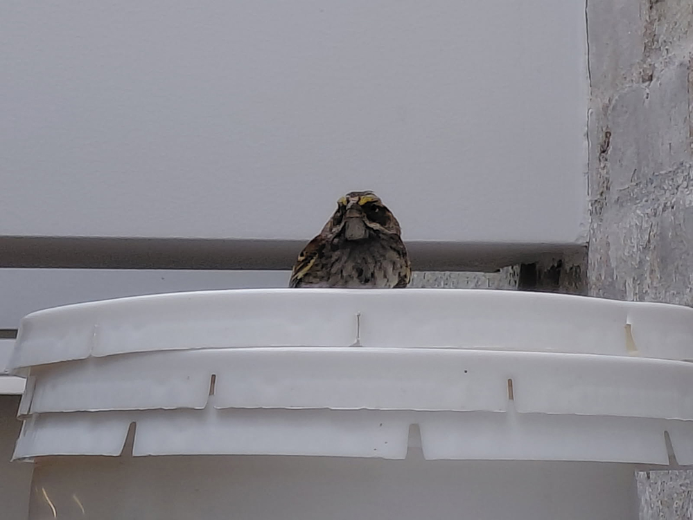 The next day, it was in the mezzanine and still would not fly out the three open doorways. That is when RISE called and e-mailed NYC Department of Parks & Recreation, specifically Queens Urban Park Rangers. M. Moshen and E. Vool responded in less than one hour and came with a net and extension pole. With a couple of ladders, a broom, and some gentle nudging, the sparrow flew from the mezzanine to the main open space and landed on the concrete floor. That is when RISE operations swooped the net down on the bird, which was let out the front door, on to Rockaway Beach Boulevard. Mission accomplished.