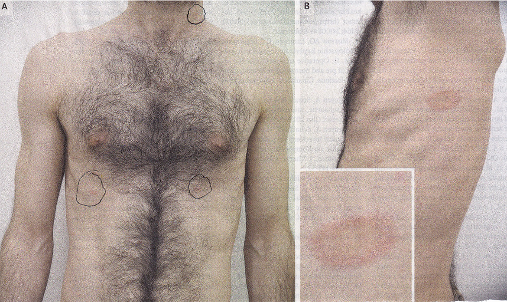 A previously healthy 42-year-old man presented to the dermatology clinic in Athens, Greece with a 20-day history of an expanding, asymptomatic rash on his trunk. The first lesion had been a red spot on the patient’s left side. Ten days after that spot first appeared, smaller lesions had started developing elsewhere. The patient denied having a prior viral infection (prodrome). Physical examination was notable for multiple 1-to 4-cm ovoid, erythematous (red), papulosquamous plaques on the chest, neck, and proximal (upper) arms (Panel A). The initial lesion – an 8.5-by-5.5-cm patch with central clearing and peripheral (outer) scaling – was seen on the midaxillary (armpit) line on the left side (Panel B and inset). On the basis of finding a “herald” patch, a diagnosis of pityriasis rosea was made.