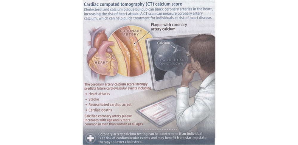 Coronary artery calcium testing can help determine if a person is at risk for ASCVD and may benefit from the use of a cholesterol-lowering medication (statin). Statin therapy is recommended for asymptomatic individuals with a coronary calcium score of 100 Agatston units or higher and may be considered for those with a score of 1 to 99 Agatston units, especially if they are younger than 45 years. Coronary artery calcium testing is not recommended for people with known ASCVD as well as people with certain conditions such as diabetes, current smoking, and familial hyperlipidemia, because for them statin therapy would be recommended regardless of calcium score. People with a coronary calcium score on gated cardiac CT who are placed on a statin should not undergo repeat testing because a change in their calcium score would not alter treatment. For those with an initial calcium score of 0, repeat testing may be considered after five years in those older than 40 years.
